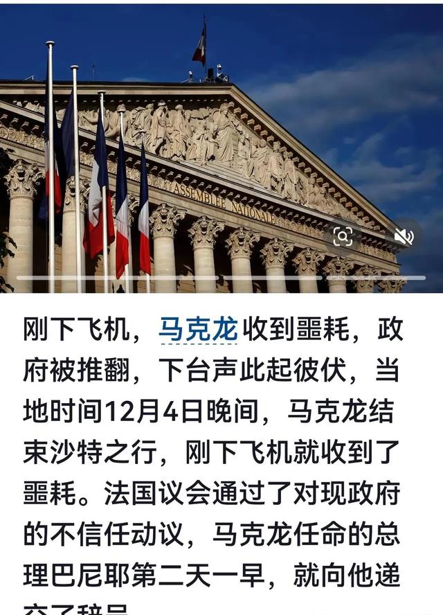 法国总统马克龙在 12 月初出访沙特归来时,惊闻总理辞职,政府垮台。此消息如重磅炸弹,在法国乃至国际政治舞台掀起波澜。