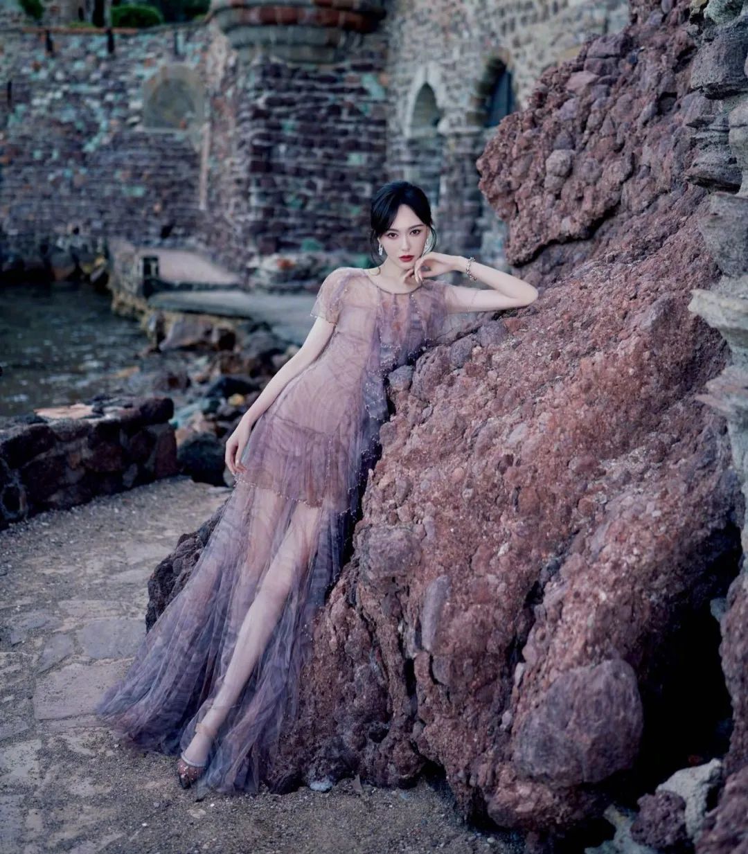 因为长裙的薄纱面料看上去很轻薄,所以还有一股透视的效果,虽然裙摆已经拖地,但唐嫣那170+身高的大长腿仍然在裙身中若隐若现,优美的线条感透露出致命的吸引力。