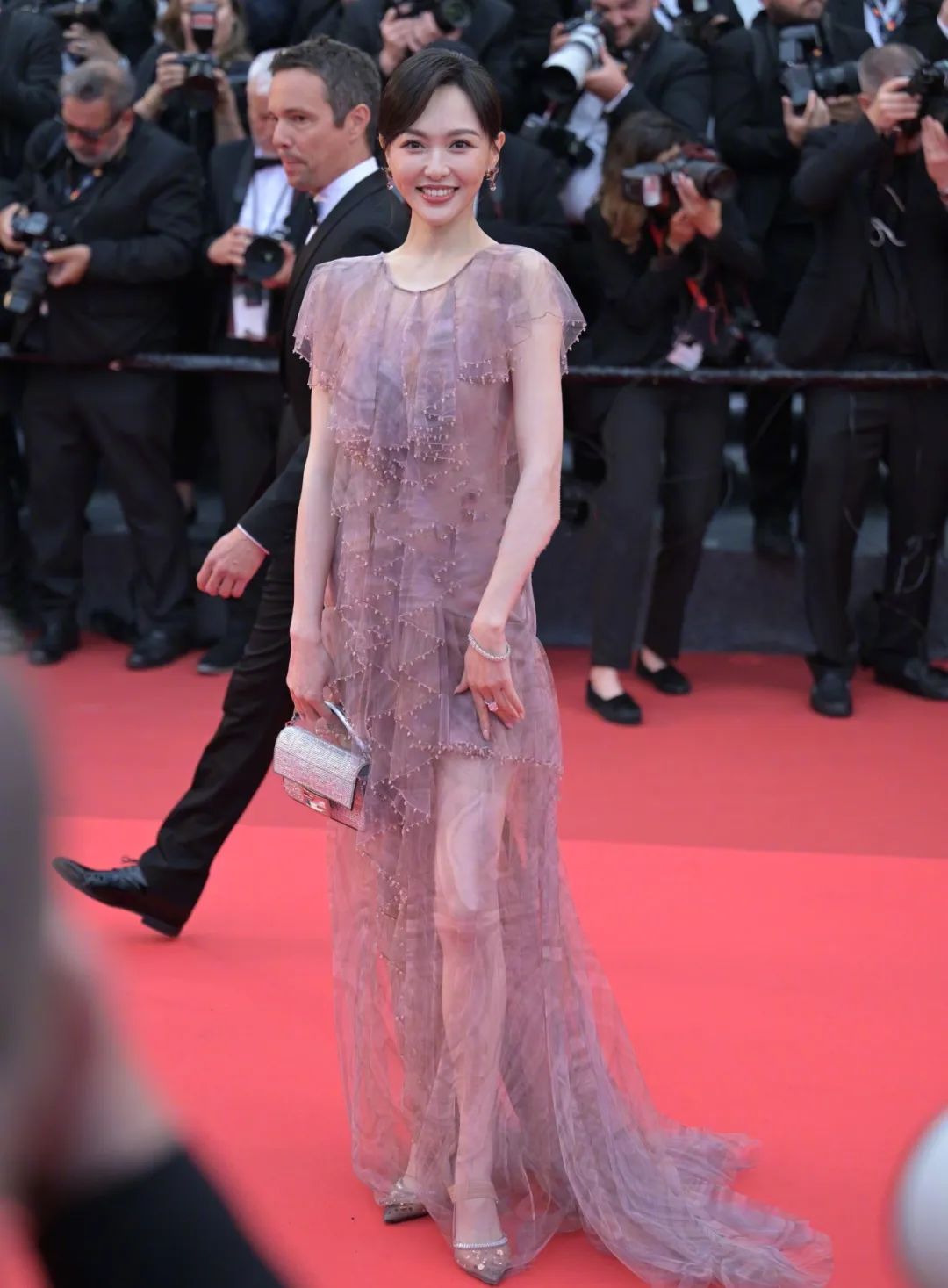 本就走甜美风的唐嫣,在这条长裙的衬托下更加显得明媚娇俏,她在红毯上大肆微笑,对着镜头招手飞吻,就像是一个紫色的小精灵,在红毯上闪耀全场。