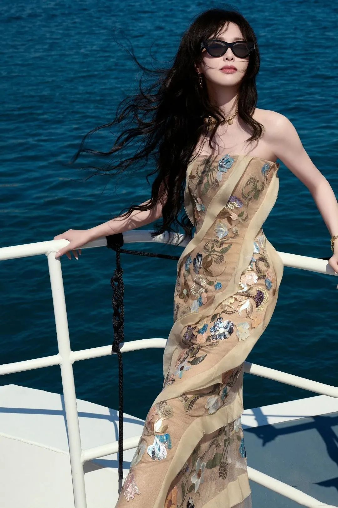 长裙的裙身是不规则花边设计,显得轻盈飘逸,为唐嫣增添了一股仙气飘飘的感觉。后背的深V大露背设计,为她的知性优雅增加了几分性感俏皮的韵味,轻轻松松撩人心弦。
