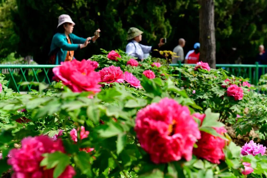 在菏泽市曹州牡丹园,盛开的牡丹吸引游客驻足欣赏。新华社记者 郭绪雷 摄