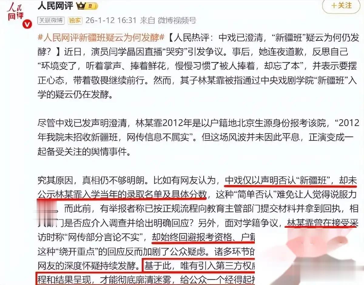 中戏虽然火速出来辟谣说那年没招新疆班,可网友不是吃素的,互联网是有记忆的。闫学晶自己在直播里得意洋洋爆出的料,现在成了扇向母子俩最狠的耳光。人民网都下场呼吁彻查了,这背后的水有多深,恐怕不是发个声明就能盖过去的。