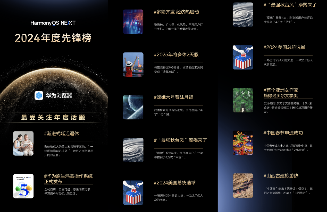 这两天,华为各大应用的2024年终榜单「2024年度先锋榜」终于揭晓。榜单盘点了2024年大家都在关注的书籍、音乐、应用、游戏等,《庆余年》《乘风2024》《抓娃娃》这些热门内容纷纷上榜。这回华为看似是晒了几个榜单,但我却觉得是实实在在秀了波肌肉,它展示了这些应用的新特性以及告诉大家具体该怎么玩!就拿我最常用的华为阅读和华为浏览器来说吧,在我升级HarmonyOS NEXT后,完全是全新的体验。