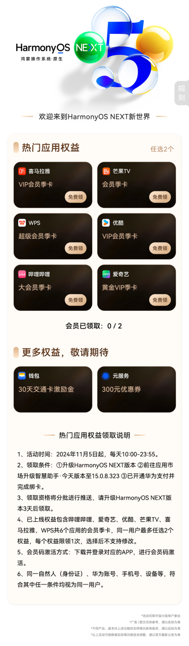 不止华为阅读和华为浏览器,像华为音乐、华为视频这些华为App都有新特性可以体验。如果你也想要体验这些新特性的话,只需打开“我的华为”App,点击首页“升级尝鲜”即可报名升级HarmonyOS NEXT。不仅如此,升级后还有超多福利可以领!价值高达900元的HarmonyOS NEXT先锋权益,包括华为音乐、华为视频、华为阅读等应用会员权益,以及超多三方影音娱乐应用的会员权益领取。