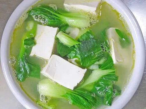 做法:嫩豆腐切小块,青菜切段,水开下豆腐煮 3 分钟,加青菜煮 1 分钟,放少许盐。