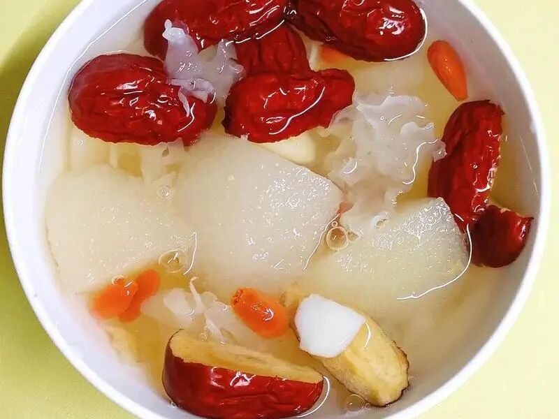做法:银耳泡发撕小朵,加雪梨块、干百合煮 40 分钟,放少许冰糖(宝宝吃不加)。