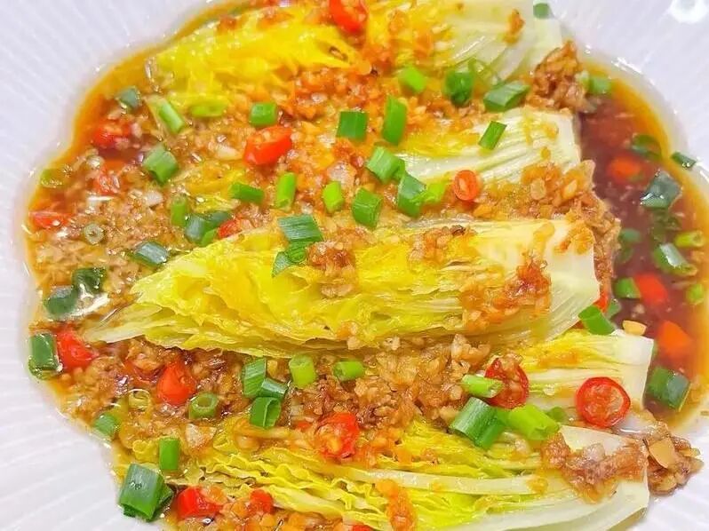 做法:娃娃菜切 4 瓣,摆盘放蒜末,蒸锅蒸 10 分钟,淋一勺生抽、少许葱花。