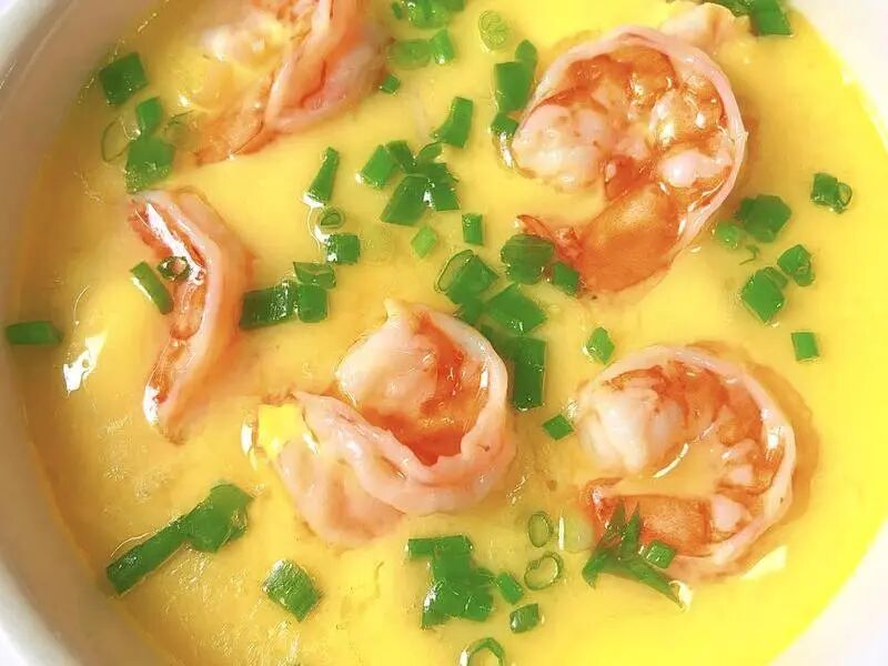 做法:3 个鸡蛋加 1.5 倍温水搅匀,过筛后蒸 10 分钟,表面放去虾线的虾仁再蒸 5 分钟,淋香油。
