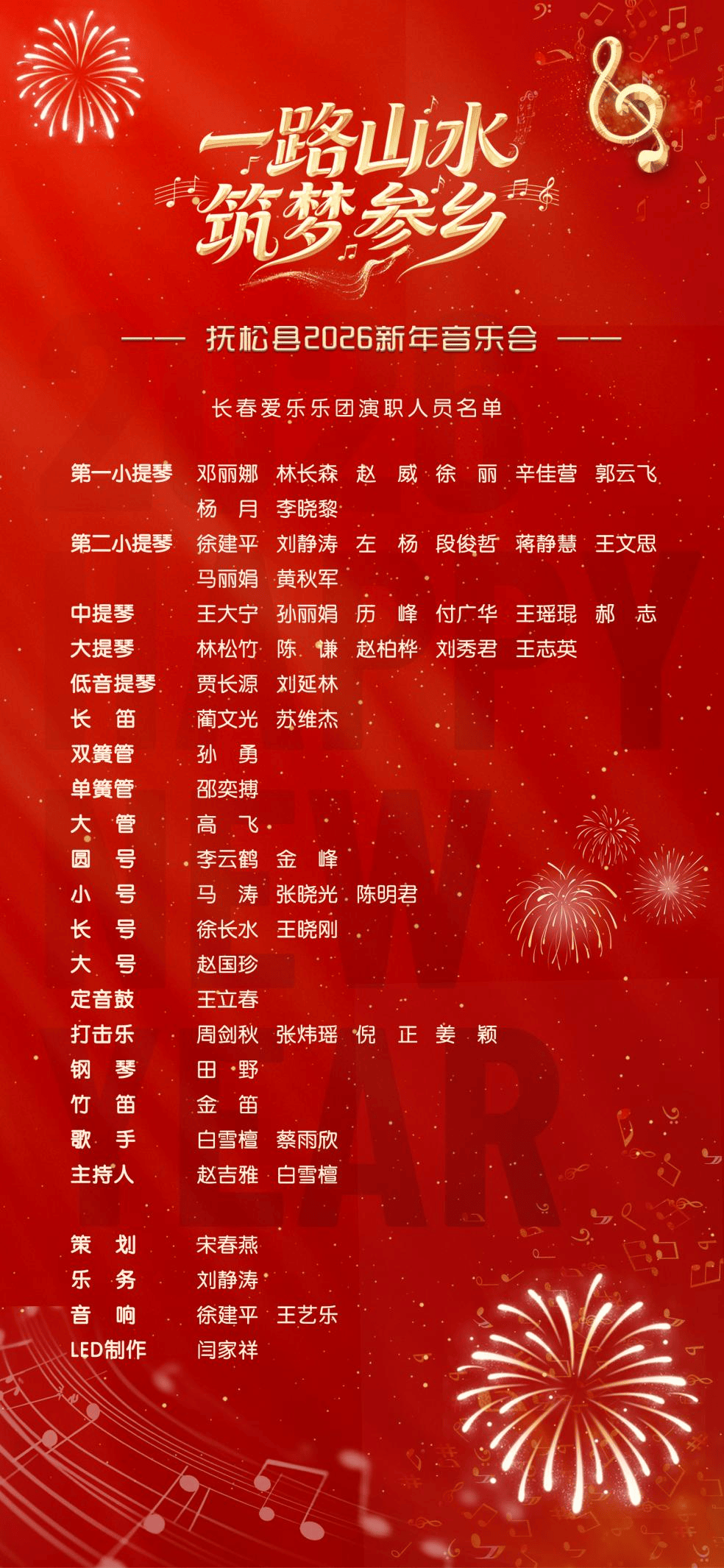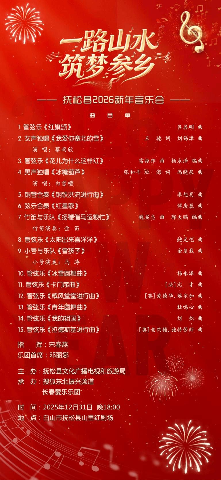 12月31日18时,抚松县山里红剧场将被美妙旋律填满——由抚松县文化广播电视和旅游局主办,搜狐东北振兴频道、吉林省时尚产业联合会、长春爱乐乐团承办的“一路山水 筑梦参乡”抚松县2026新年音乐会将奏响跨年乐章!