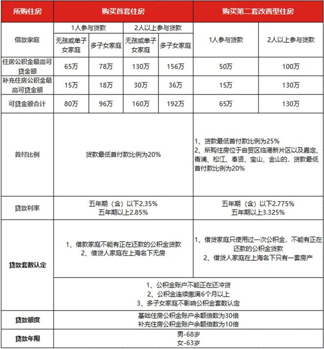 今年1月,上海公积金贷款政策已经迎来调整:放宽年龄上限,最高可再加5年。公积金贷款额度、首付及利率情况如下表:
