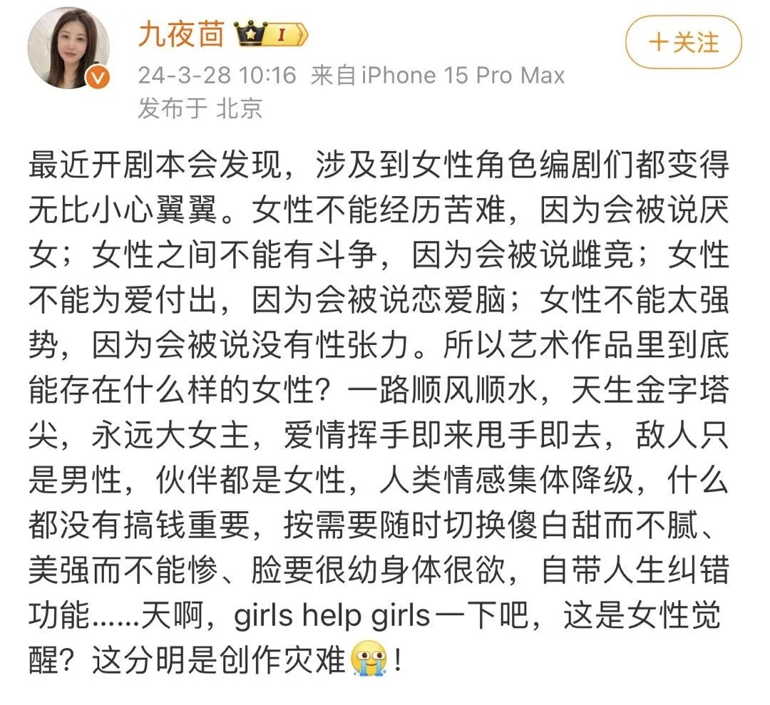 不被“正确”所困2024年,编剧九夜茴曾发微博感慨创作女性角色的艰难,“女性不能经历苦难,因为会被说厌女;女性之间不能有斗争,因为会被说雌竞;女性不能为爱付出,因为会被说恋爱脑……这是女性觉醒?这分明是创作灾难!”