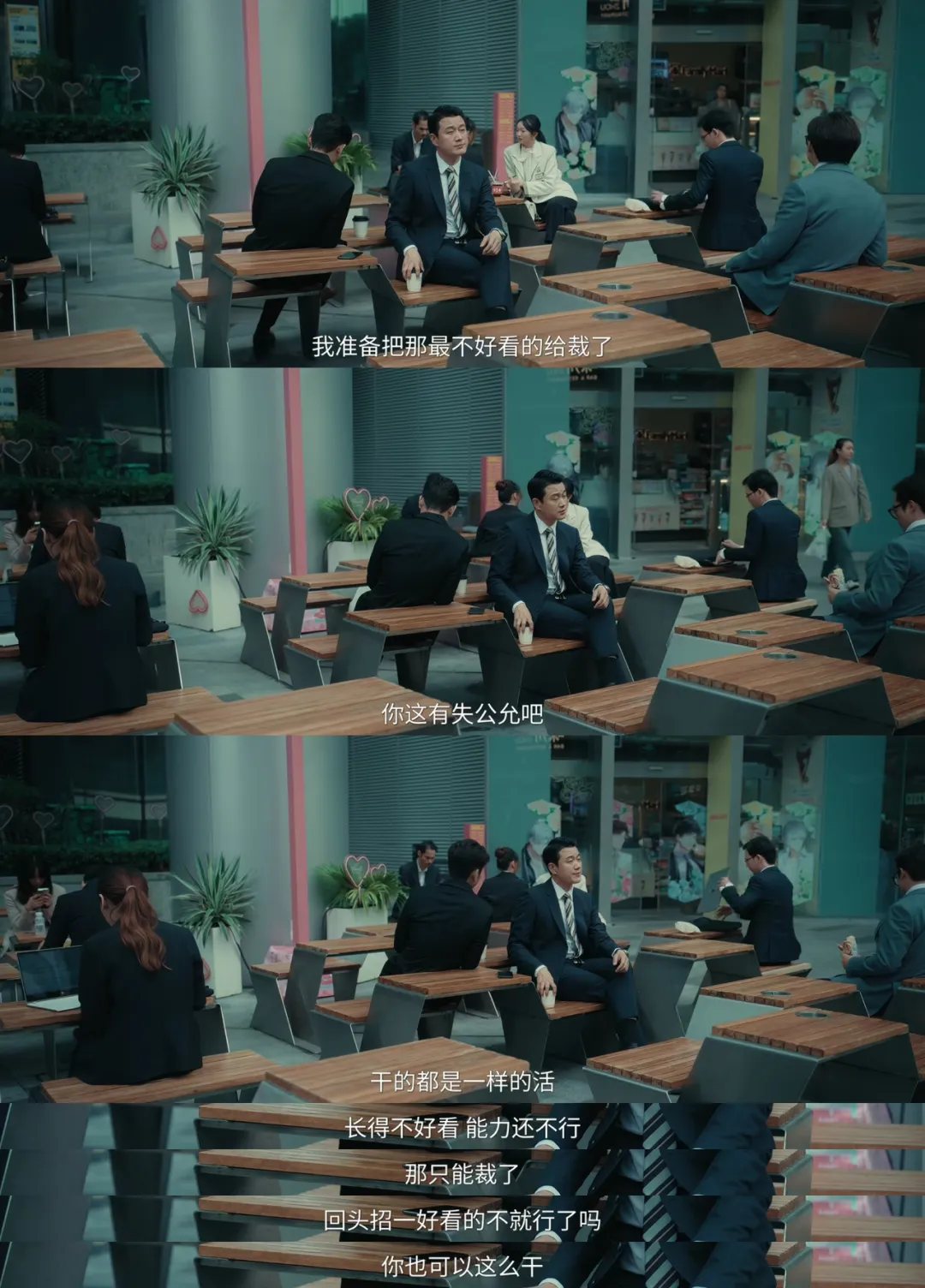 这场戏虽然小,但很有代表性。这句轻飘飘的话,透着一种荒谬,又有一种格外真实的冰冷。荒谬是因为这个裁员理由毫无逻辑,而冰冷是因为看剧的观众知道,这在现实中确有可能——在员工看来至关重要的去留,很多时候并不与自己的业务能力挂钩。