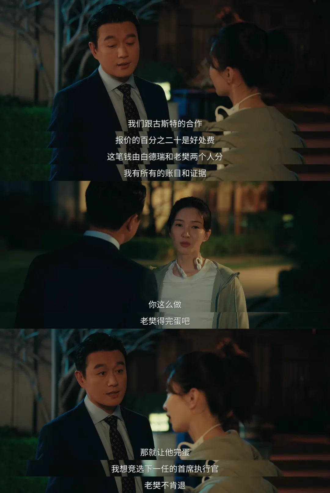 她的选择引发了一连串的蝴蝶反应。许云天下台了,身为下属的赵玫要怎么站队?空出来的销售总监,她还要不要继续争?还有董越(张超 饰),他是要继续通过“吃软饭”来维系和沈默的同盟,还是要另起炉灶?