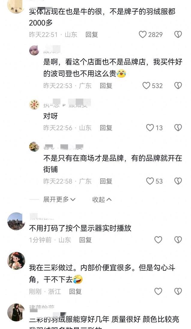 网友称实体店现在也是牛的很!不是牌子的羽绒服都要2000多。