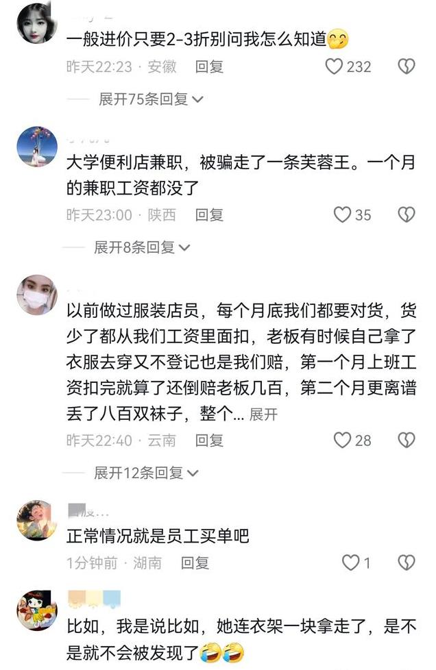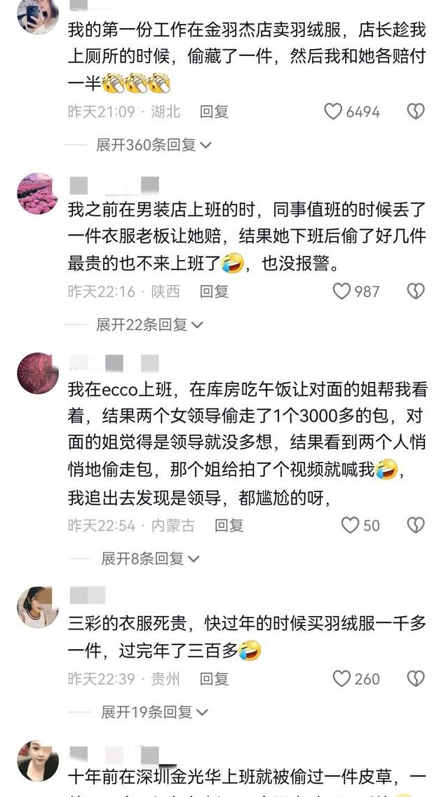 网友称之前自己在男装店上班时,同事值班时丢了好几件衣服老板让她赔,结果她下班偷了好几件贵的就再也没回来。