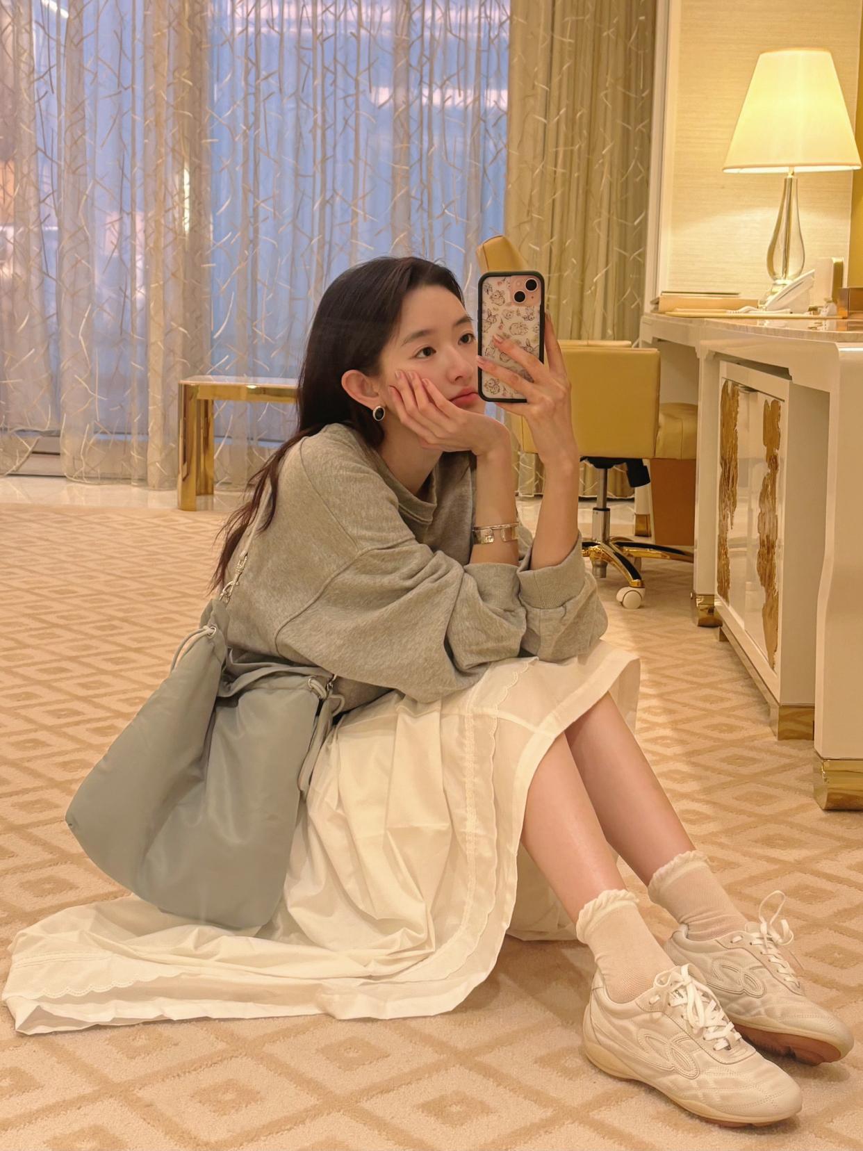 初夏时节的谁还没有遇见轻薄款的卫衣,搭配白色白色半身裙,像王玉雯这样,呈现出上半身宽松下半身轻盈的感觉,运动鞋进一步增加休闲感。出门挎上灰色单肩包,展现出优雅清新不失浪漫气质,时尚又减龄。