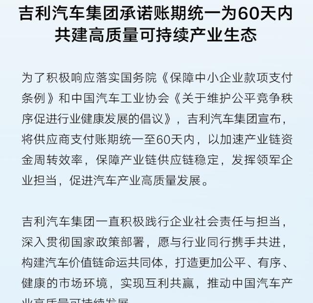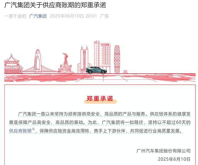 20:01,广汽集团第一个跳出来,在自家公众号上喊话:以后咱家供应商的账期,一律不超过60天!