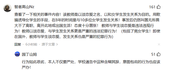 查看了一下相关的事件内容!该教师是以谈恋爱之名,以和女学生发生关系为目的。用欺骗诱导女学生的手段,在8年的时间里与10多位女学生发生关系!事发后仍然叫嚣无所畏大不了离职、离开此地或出国生活!态度十分嚣张! 教师与学生谈恋爱是违法违规行为!教师以谈恋爱,与学生发生关系更是严重的违法犯罪行为!(包括了男女学生!即使在国外,教师与学生谈恋爱、发生关系也是严重的犯罪行为)