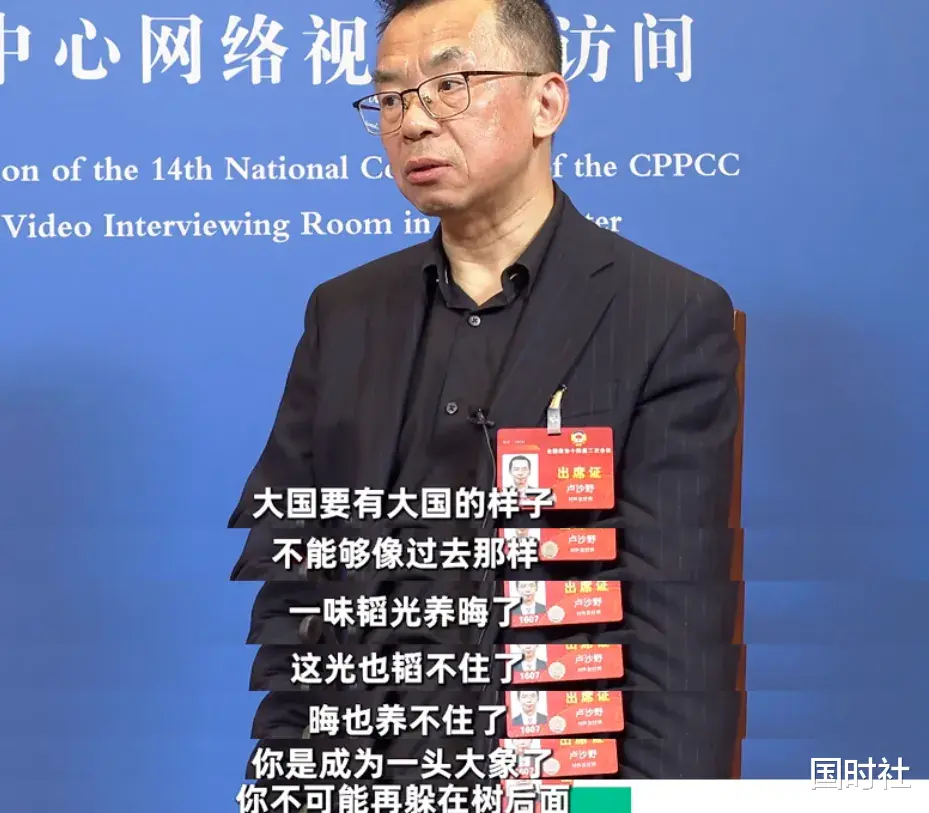 在中国比较贫穷落后的时候,西方国家跟我们打交道是俯视,现在基本上是平视,个别情况下甚至是仰视,大国要有大国的样子,不能够像过去那样一味的韬光养晦了,这光也韬不住了,晦也养不住了,你是成为一头大象了,你不可能再躲在树后面。