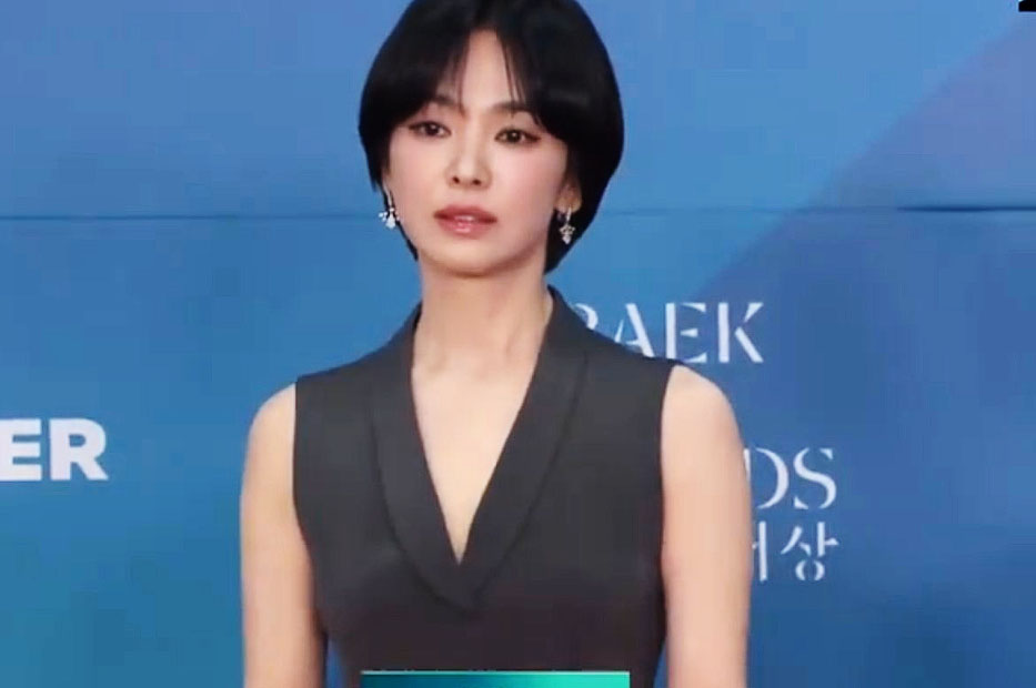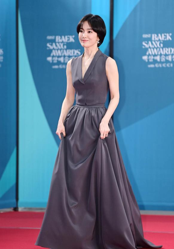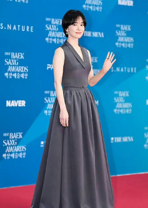 5月5日,43岁的宋慧乔在百想红毯上彻底鲨疯了!当国内95后小花们还在裹着蓬蓬裙扮迪士尼在逃公主时,这位姐踩着10cm高跟鞋杀出来,直接把红毯变成女王登基现场。灰色西装裙配利落短发,网友锐评:"教导主任要长这样,我天天早自习坐第一排!"