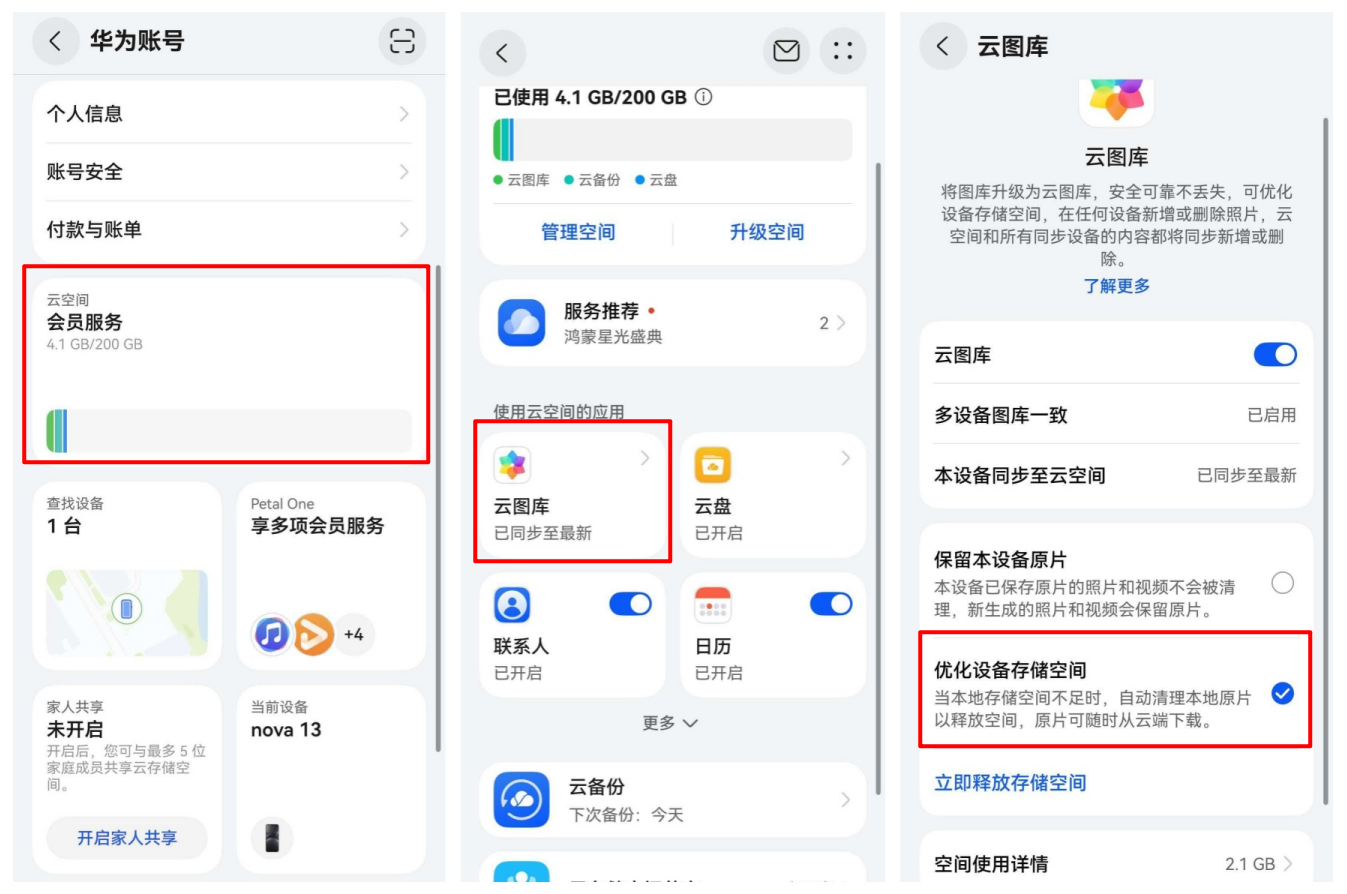 不需要下载什么App,在设置里点进自己的HUAWEI ID就能找到它,他就是华为云空间。强烈安利大家趁着跨年之际赶紧打开里面的“云图库”,并且勾选“优化设备存储空间”。这个功能简直是我的“救命稻草”——它会默默把手机上的高清原图和视频安全同步到云端,而本地不常用的照片视频替换为小图预览。明明一张照片没删,手机却腾出了十几个GB的存储空间,用来存跨年的新照片绰绰有余。
