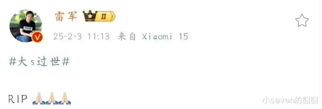 2月3日大年初五,台湾知名艺人大S徐熙媛在旅途中因病不幸离世,年仅48岁 。她的突然离去,让无数粉丝和观众深感震惊与悲痛。就连雷军都忍不住发文悼念。