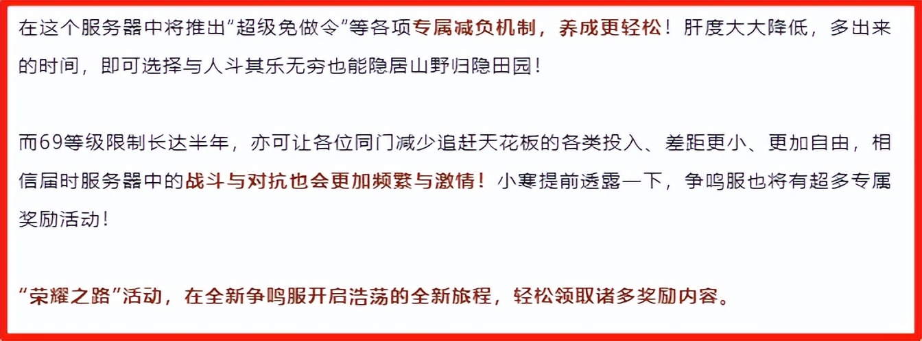 当然了,有些人可能会有疑惑,锁定69的话跨服玩法怎么办?会不会让一些勤奋的玩家无聊?这一点逆水寒也有所交待,那就是会独立于老区服务器,并且会开辟新的跨服玩法,还会针对69争鸣服增开额外的赛事体系,一些等级限制的副本也会提前开放。