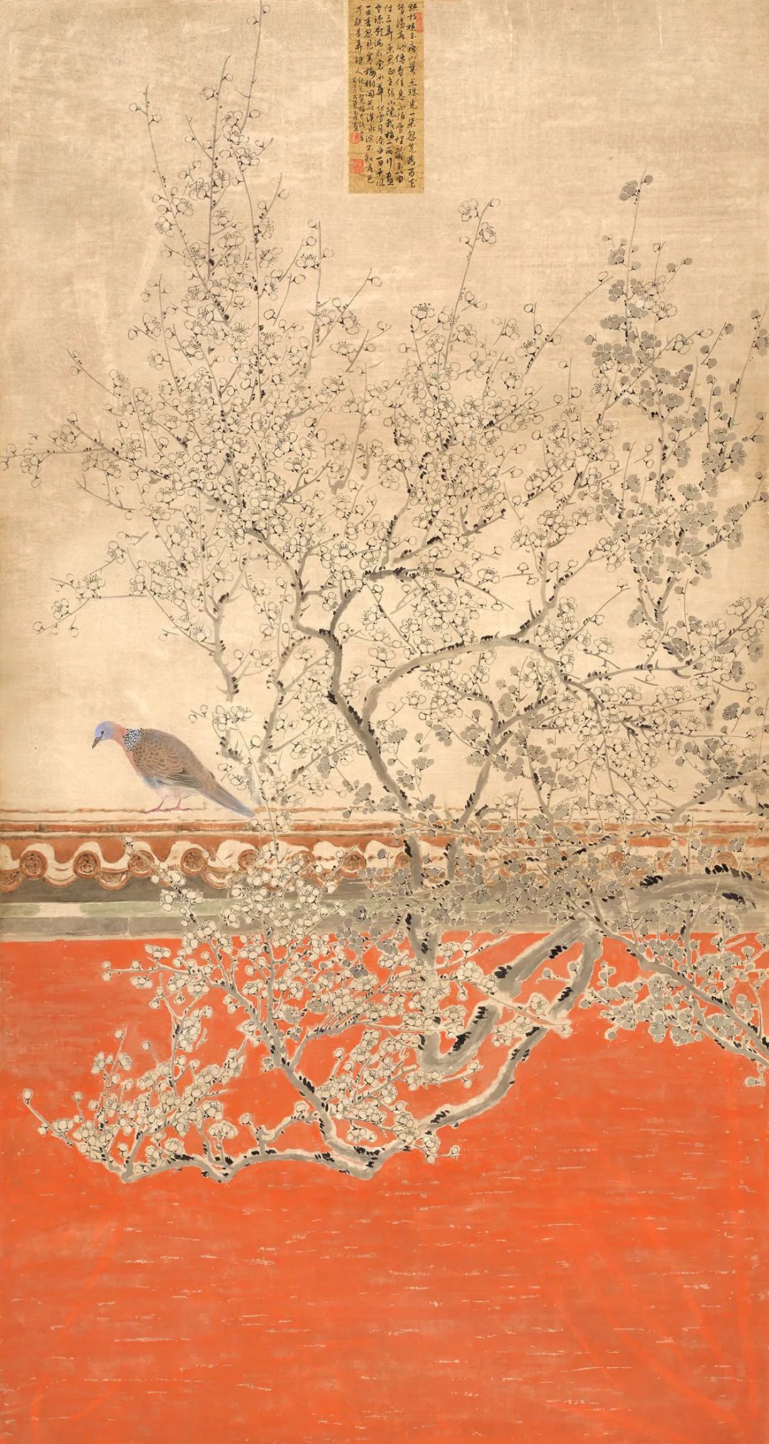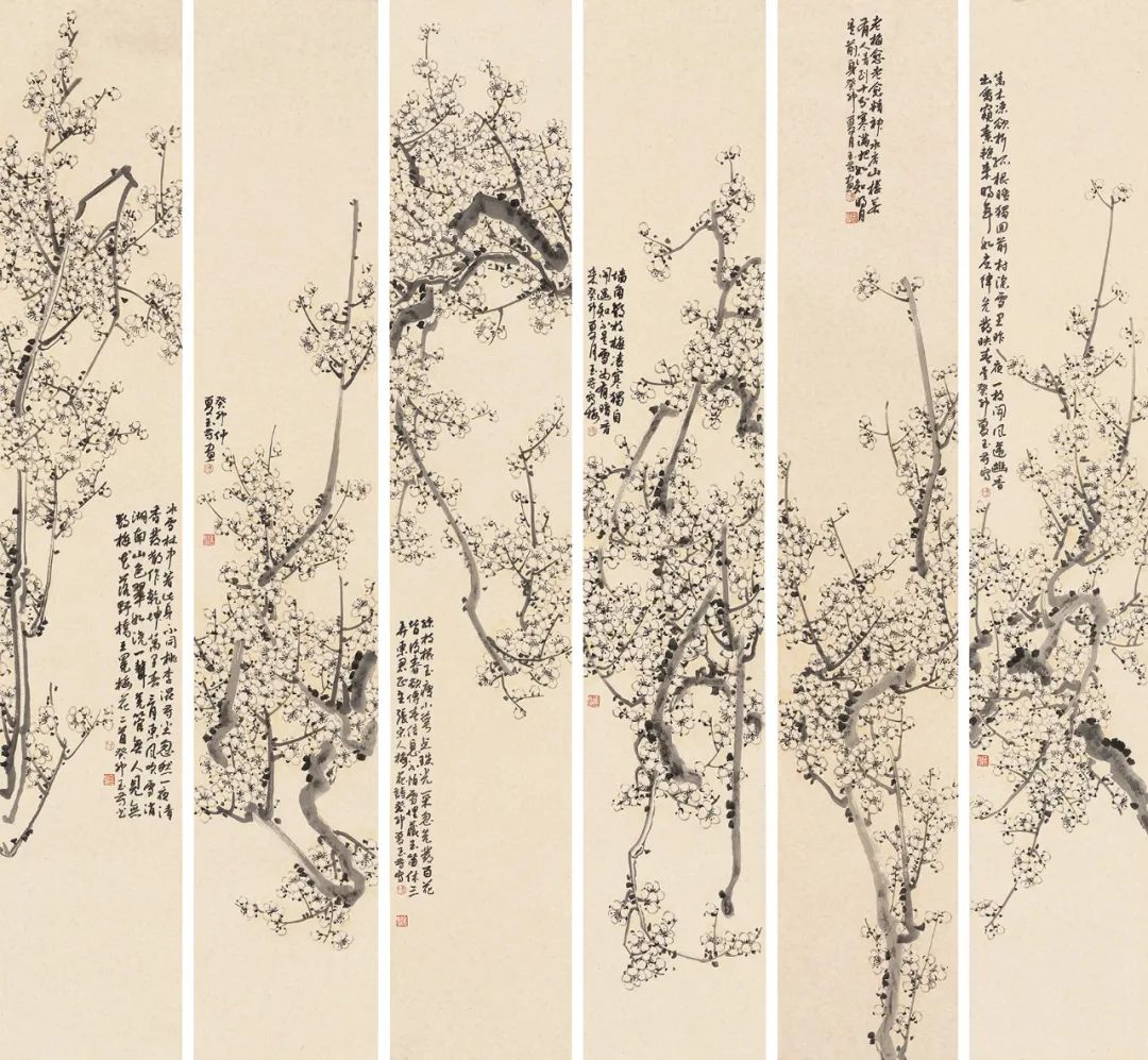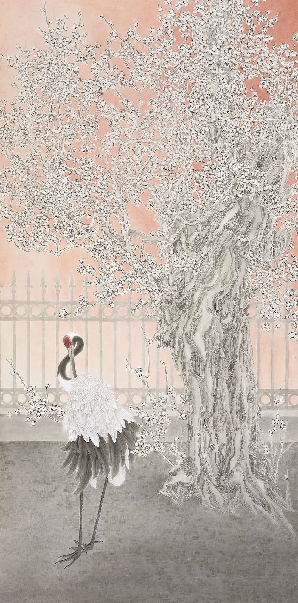花鸟画家恽南田曾说,花鸟画应有一种特别的“香”意,不是花的香味,而是心灵的香意。花鸟画是中国传统三大画科之一,所描绘的对象不仅仅只是现实中的花卉禽鸟,更体现了人与自然生物的审美关系。陈玉芳老师用笔墨舒展出花的骨、气,支撑起禽鸟的筋、肉,将中国传统花鸟画的气韵表现的淋漓尽致。陈老师作画习惯用绢本,绢的纹理与画的细节、水墨与颜色、工笔与写意交相烘染,增添了画作的质感与立体感,更具艺术气息。在陈老师的花鸟画作中,折枝是最常见的,有单独一枝的,娟秀清雅,有一簇的,繁花有致,起落间更显意境之美,更具特色的是树干,尤其老干,不论枯藤桠枝还是葱郁繁茂,总有一种幽深、静谧、高洁之韵。时值新旧交替,凛冬时节,梅花傲雪绽放,点缀了单一枯燥的冬天,陈玉芳老师研析梅花多年,其墨梅最具神韵,从小品、圆扇、扇面到斗方、八尺条十二条屏,娴熟的笔法,深邃的意境,浓淡疏密,跌宕峻拔,主干以淡墨挥洒,浓墨点苔,苍古老拙;分枝以中锋勾撇,颇得扬无咎笔意,将梅的坚韧无畏、自强不息勾勒的高远传神,清幽古雅而不失潇洒。另牡丹以淡墨双钩,施以淡彩渲染,有“没骨”之韵,引人入胜。