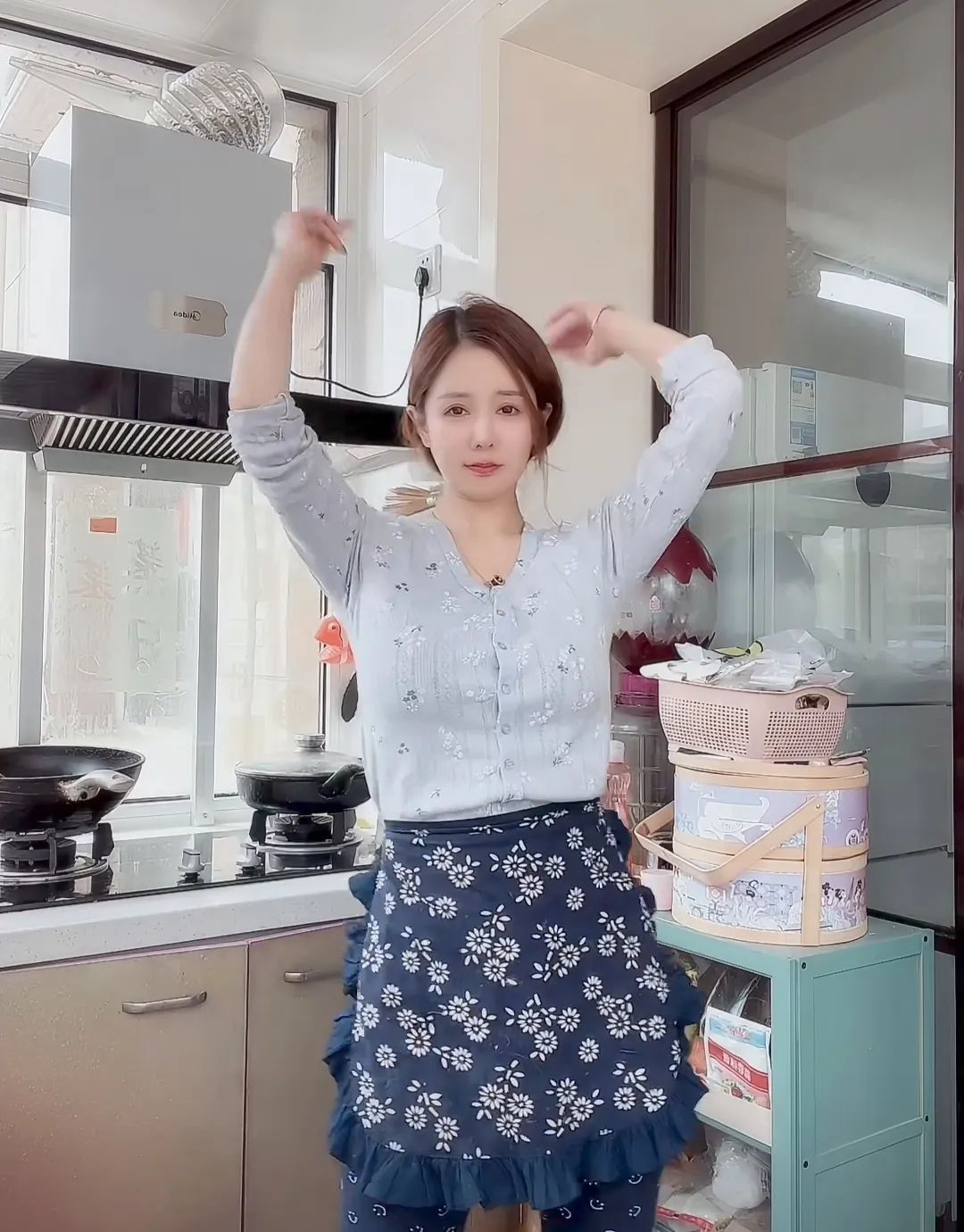 身着碎花围裙的林姨正站在料理台前,手腕轻转,竹制蒸笼里粉白的山药糕氤氲着热气。她鬓角别着栀子花发簪,围裙上深浅不一的蓝印花纹随动作流淌,恍若宣纸上晕染的水墨。