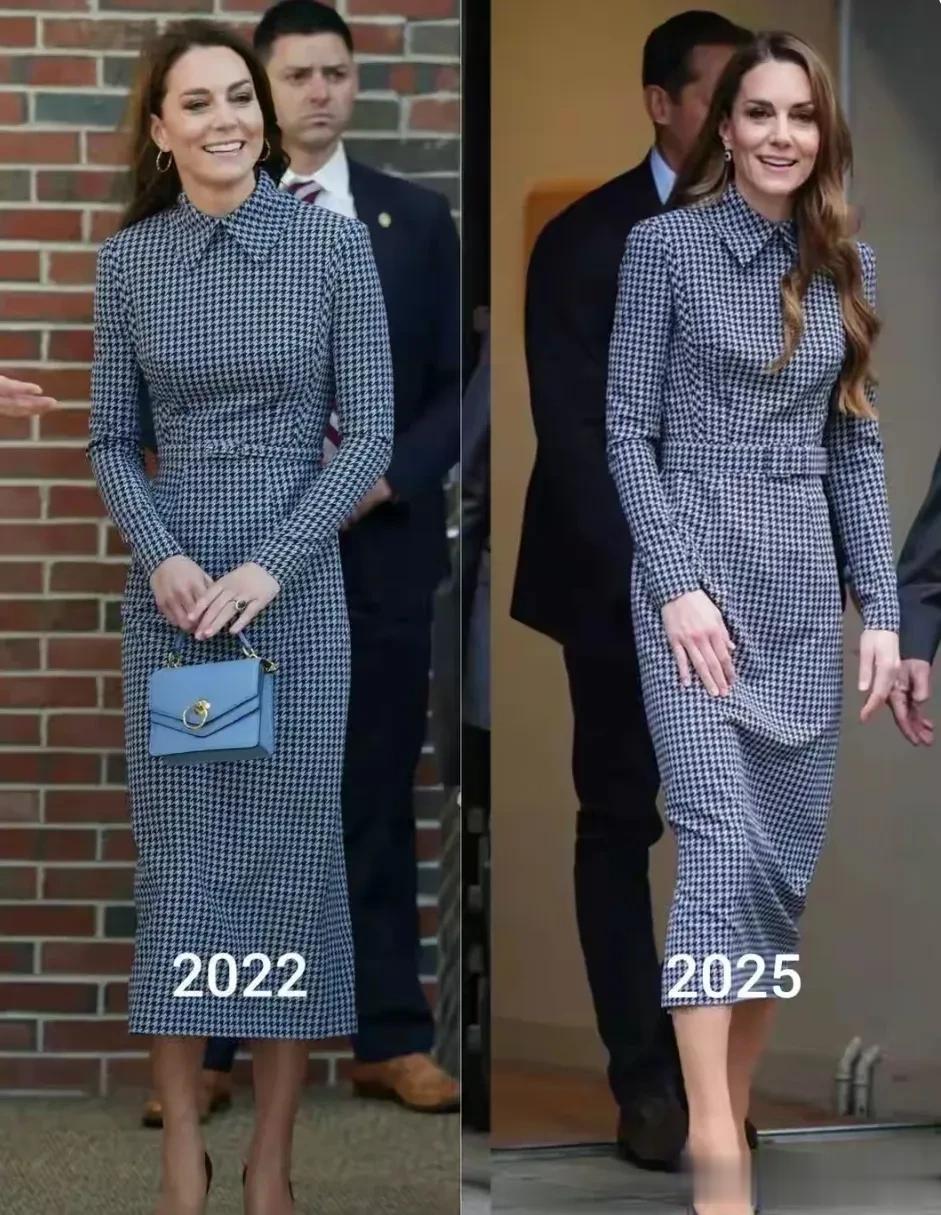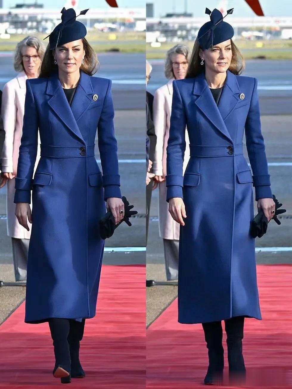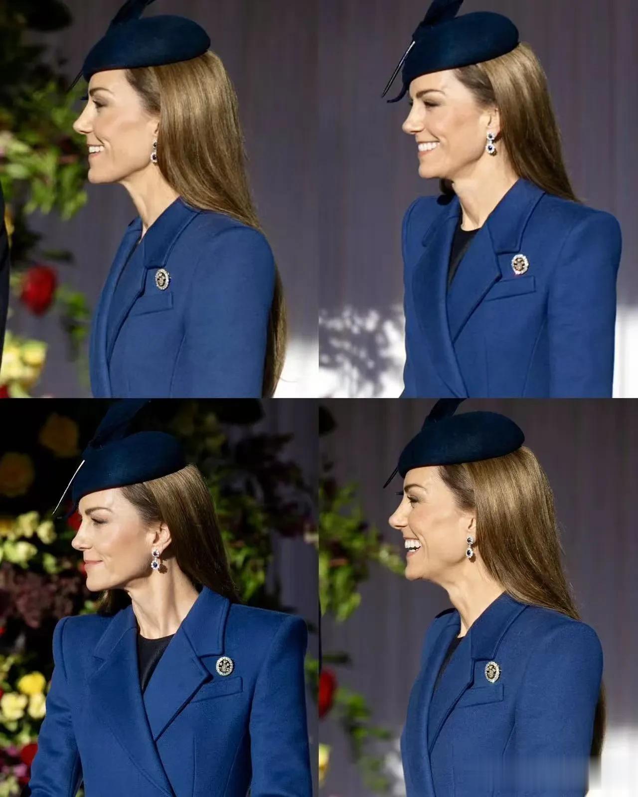 凯特依然延续了她一贯穿旧衣的风格,选择了2023年圣诞节时穿过的麦昆蓝色大衣,那一次正是凯特患病前的最后一次公开亮相,当时这套装扮端庄而高贵给人们留下了深刻的印象。