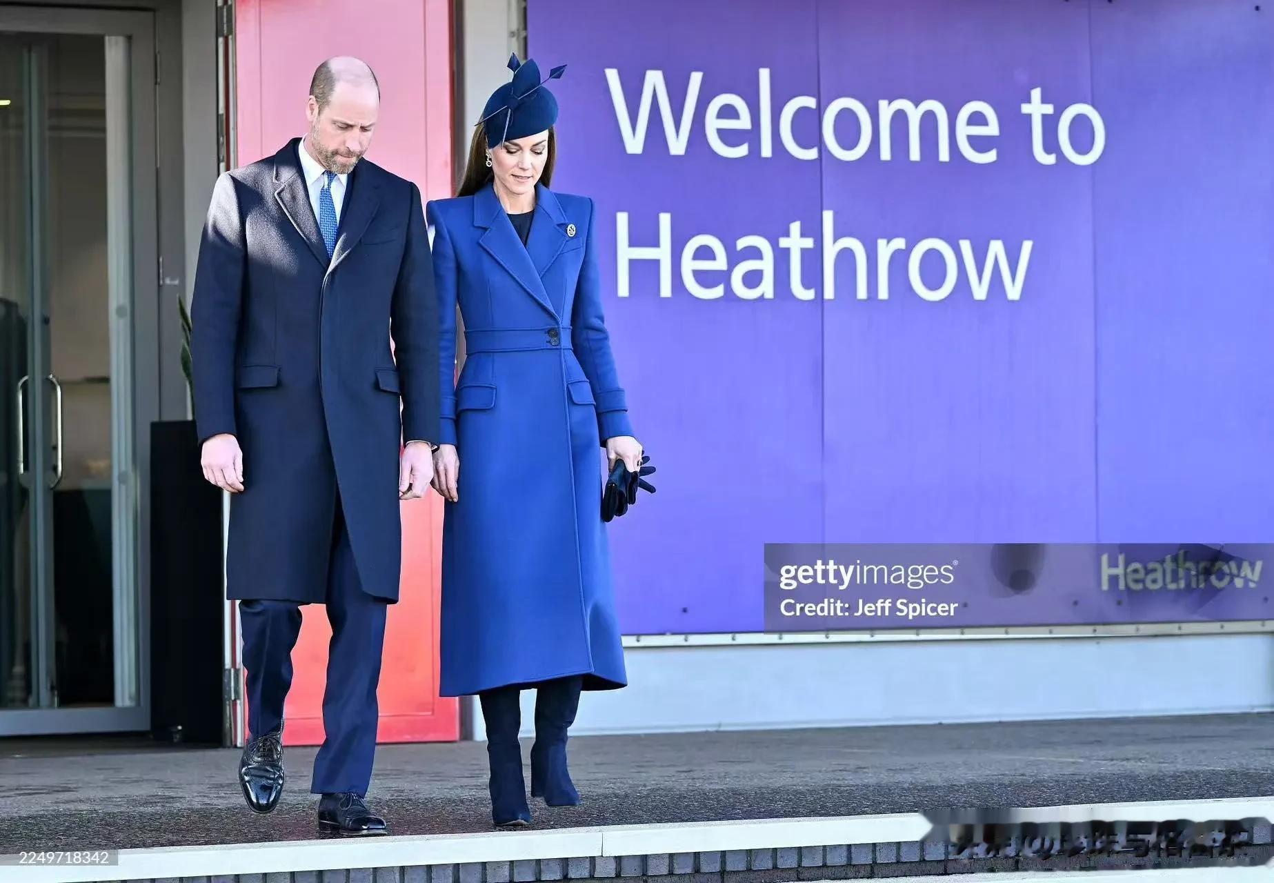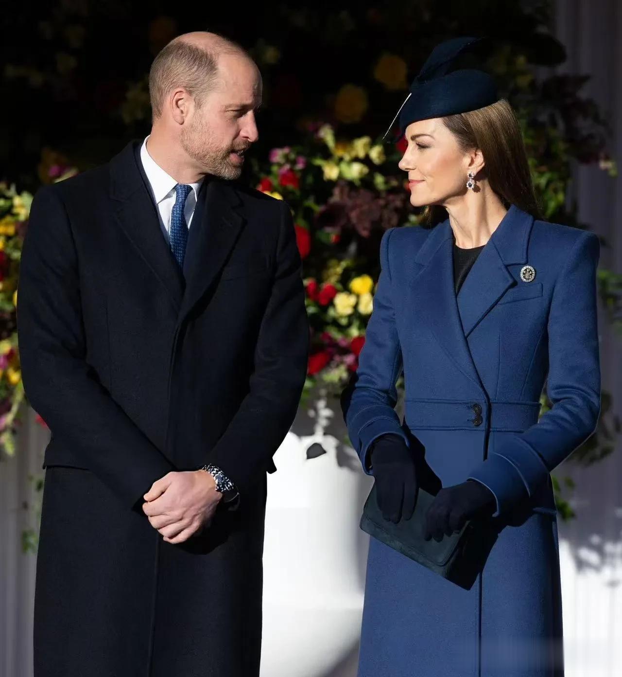威廉与凯特肩并肩出现时,人们还注意到了这对夫妇非常默契的情侣穿搭,阳光下能看出威廉王子也是穿了与妻子同色系的深蓝色大衣,特别是他的蓝色领带,与凯特的大衣颜色是一样色调的蓝色。