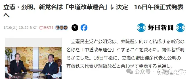 立宪民主党与公明党宣布组建新党-“中道改革联盟”。新党横空出世,展现出不容小觑的政治影响力。原本在高市早苗内阁高支持率加持下,被普遍预测为自民党“大胜”的众议院大选形势,正在发生明显逆转。