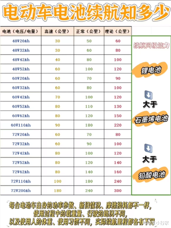 电池容量多大,可以续航100公里,小行家找到两个根据不同载重、使用习惯给出的参考续航表格。
