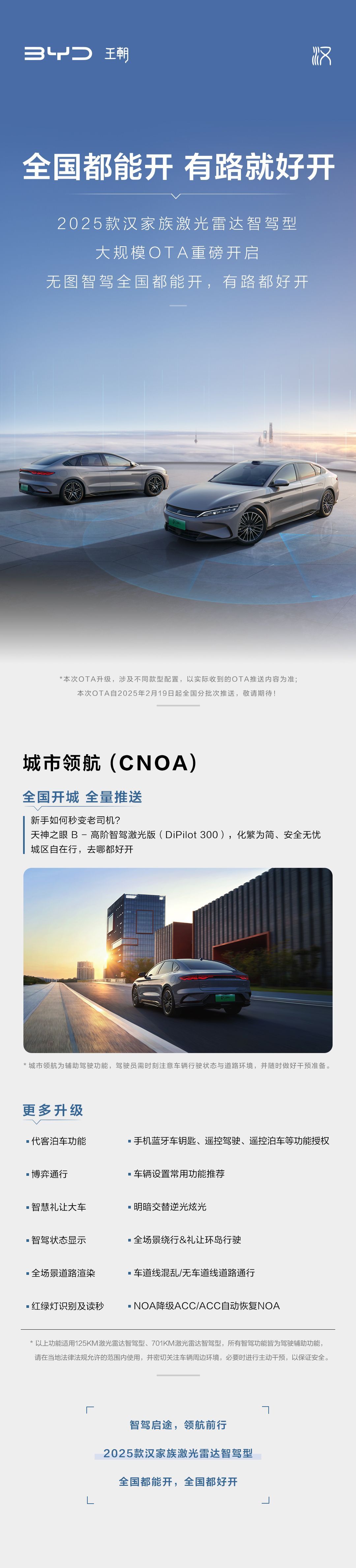 王朝家族迎来重要升级!2月19日起,比亚迪2025款汉激光雷达智驾型向全部用户OTA推送。OTA车型包括2025款汉125KM和701KM激光雷达智驾型。此次升级新增5项功能、优化6项体验,城市领航和代客泊车功能更新是最大亮点。无图城市领航功能覆盖全国,可进行红绿灯识别、车道线混乱或无车道线道路通行等高阶智驾操作。