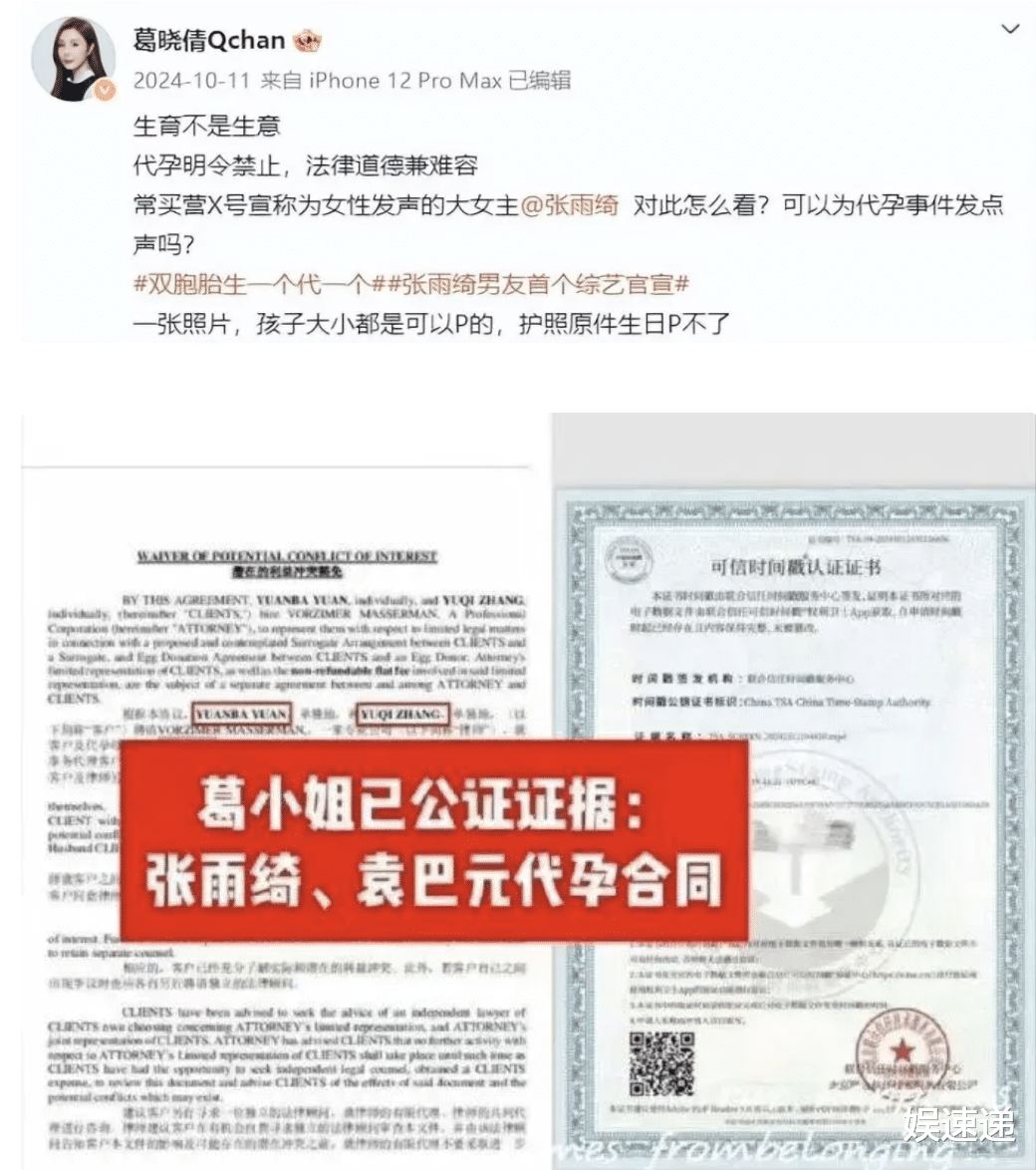 而后又借着脱口秀上“于是分手了”的大女主言论,爆出张雨绮的双胞胎是通过代孕途径获得的,甚至还晒出了合同。