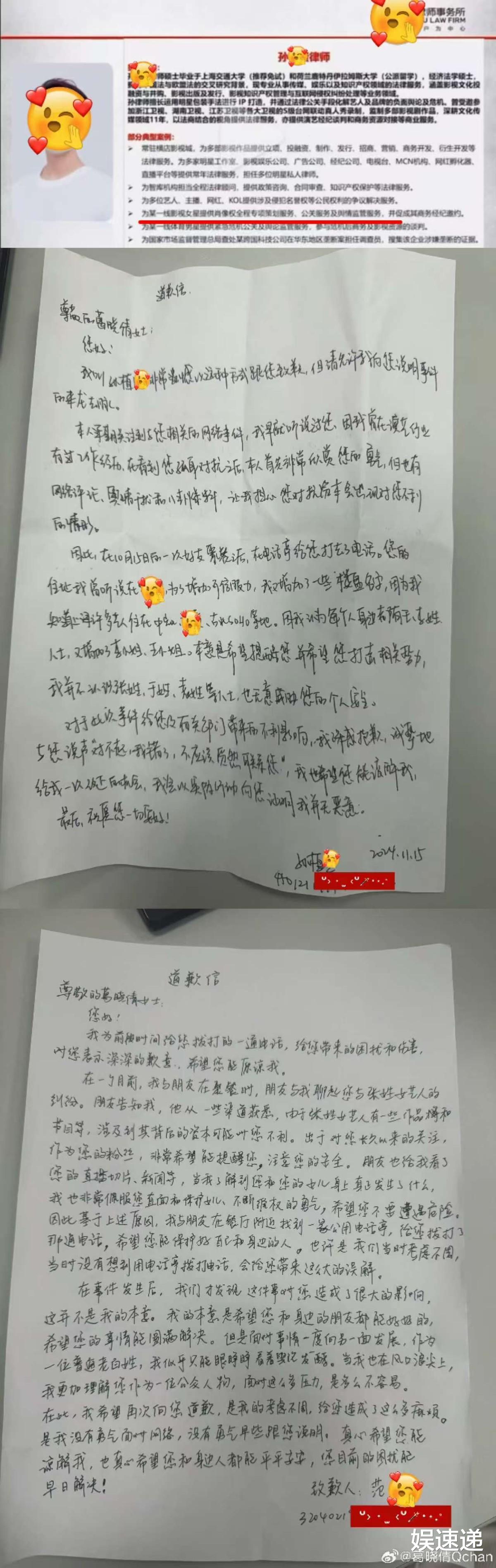 就在张雨绮挠头皮想对策的时候,她前夫哥的前妻姐——葛晓倩在凌晨突然甩出两封道歉信,并且还是诚意十足的手写版本,不过不是前妻姐的道歉信而是来自两名律师的。
