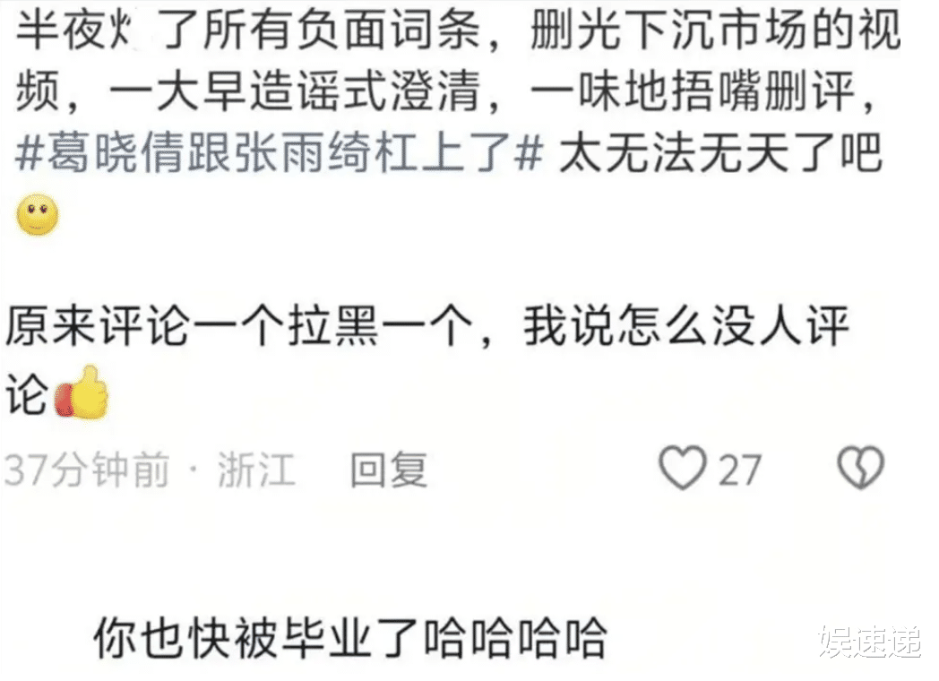 但很明显这种消极捂嘴的方式并不能解决问题,反而会激发网友的反感,不知道张雨绮的团队打算如何应对。