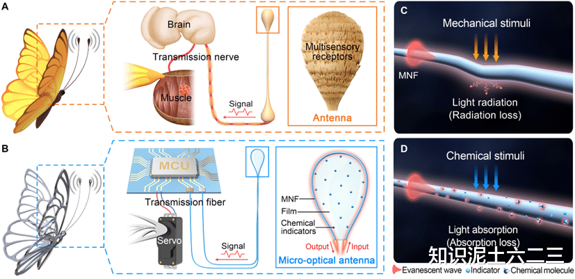 在自然界中,蝴蝶的触角能感知气流、蜜蜂的触角能捕捉声波与气味,昆虫经过亿万年进化的天线系统,堪称自然界最精密的 “多感官传感器”。如今,浙江大学团队从昆虫触角中汲取灵感,研发出一款微光学天线(MOA),成功让机器人也拥有了媲美生物的触觉、听觉和嗅觉感知能力。