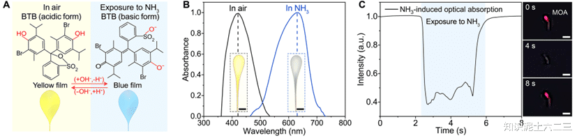 MOA 的嗅觉感知依赖聚合物薄膜中的化学指示剂,以氨气检测为例: