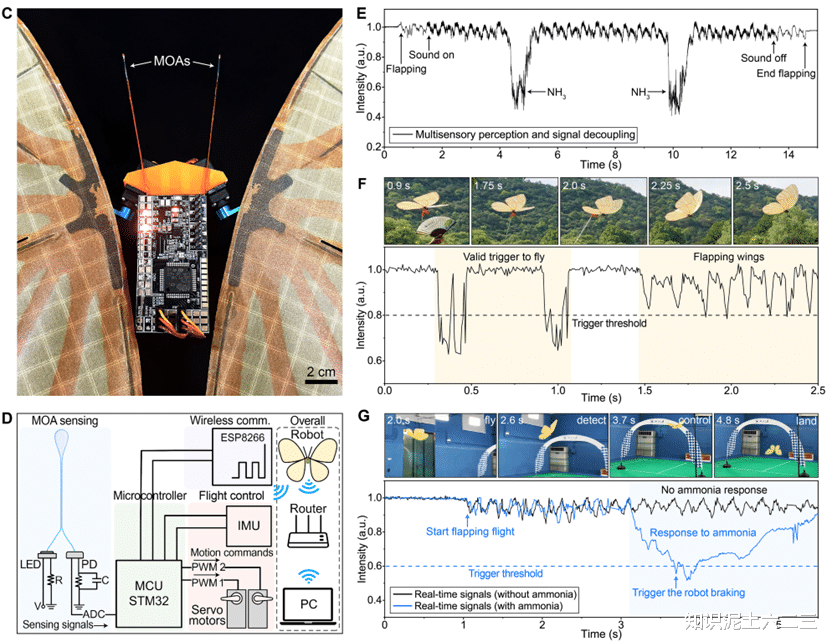 研究团队将 MOA 集成到总重不足 6 克的扑翼蝴蝶机器人上,两个 MOA 对称安装在头部,如同昆虫的触角。该集成系统具备三大能力: