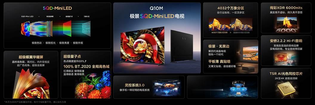 Q10M则代表着TCL技术普惠的坚定决心。其在核心显示技术上与Pro版看齐,同样实现了SQD技术的100% BT.2020全局高色域、超级量子点与超级蝶翼华曜屏的越级搭载。在万象分区数量、峰值亮度及芯片算力等方面亦实现大幅升级,确保在主流价位提供超越期待的旗舰画质体验。TCL Q10M的出现,将SQD-Mini LED的体验门槛大幅降低。