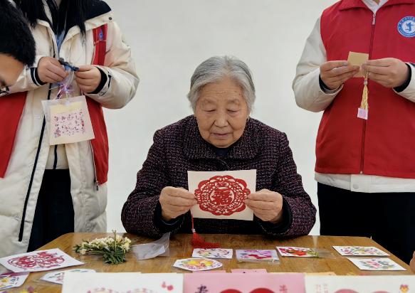 活动当日,实践队成员们满怀热情,来到社区养老服务中心。他们不仅带来了青春的气息,更将一项珍贵的非遗艺术——剪纸,带进了老人们的日常生活。在中心活动室内,队员们特意邀请了一位本地剪纸传承人作为指导老师,围绕“孝”这一主题,为大家讲述剪纸艺术中所承载的伦理故事与文化记忆。老人们与队员们围坐在一起,聆听“扇枕温衾”“卧冰求鲤”等经典孝道故事如何通过一张红纸、一把巧剪,化作生动细腻的图案。在传承人细致的指导下,队员们与老人共同尝试剪纸创作。红纸翻转,剪刀轻移,一幅幅凝聚孝心与敬意的画面渐渐呈现于指尖。这一刻,非遗不再是遥远的历史符号,而成为代际之间情感交流与文化共鸣的温暖媒介。