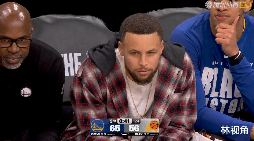 库里场边观战看嗨了,看到队友如此果断出手,命中一记记三分,库里是真开心。