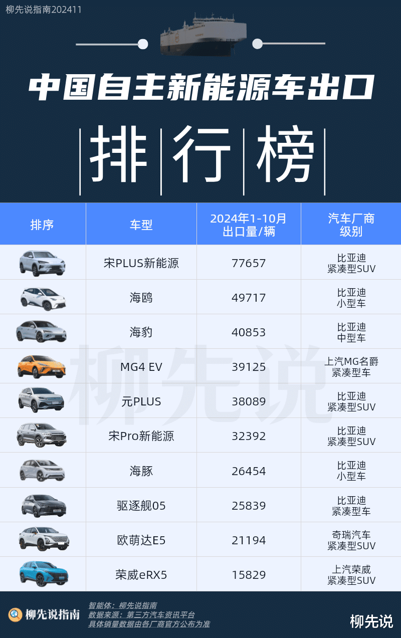 在全球新能源汽车市场持续升温的背景下,中国自主品牌的新能源汽车正以前所未有的速度走向世界舞台。根据最新公布的“中国自主新能源车出口排行榜”数据显示,2024年1月至10月期间,中国新能源汽车出口量显著增长,其中比亚迪宋PLUS新能源、海鸥以及海豹三款车型位居出口前三,成为中国新能源汽车在国际市场上的佼佼者。这背后不仅反映了中国新能源汽车产业的崛起,更展示了中国品牌在海外市场上的竞争力和影响力。