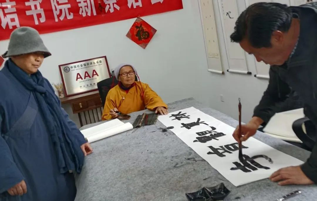 闻着花香,大家来到维摩诘书院又进行了现场参观学习交流体会。几家佛教场所负责人还请参加活动的几位书法家书写条幅和寺院牌匾,张集林东观音寺的负责人请书法家王祥良题写了《林东观音寺》牌匾。