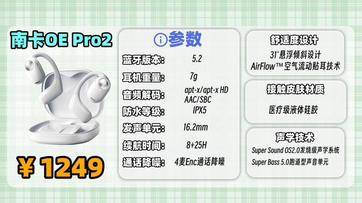 音质呈现与漏音控制,是检验开放式耳机技术水准的关键维度。作为长期专注声学领域的技术品牌,南卡的声学调校能力一直备受认可。全新推出的OE Pro2,搭载自研Super Bass 5.0高性能单元与16.2mm超大动圈,实现了“宏大音场与强劲能量”的显著突破。其超大振膜能够释放充沛低频,瞬态响应饱满有力;结合第六代高弹LCP振膜与Super Sound OS2.0声学系统,呈现出三频均衡、动态宽广的听感表现,真正迈入开放式HiFi音质的第一梯队。