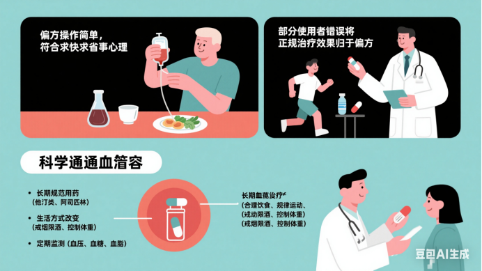 正解:这可能是最大的误区。静脉输液进入体内的液体和药物,会很快被代谢排出,其作用只能维持几小时或几天,根本无法“冲走”已经形成的动脉粥样硬化斑块。斑块是长在血管壁里面的,如同水管里的水垢,不是表面灰尘,无法被“冲洗”掉。盲目输液反而可能增加心脏负荷、引发过敏反应或电解质紊乱。预防的关键在于长期、规范的口服药物和健康生活。