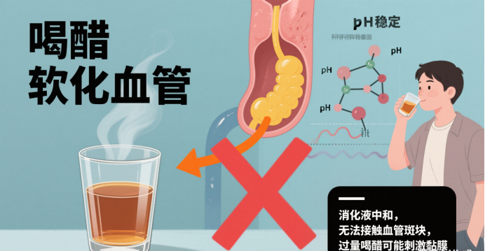 正解:喝下去的醋会进入消化道,被消化液中和,吸收进入血液的是醋酸代谢后的产物,根本不会直接接触到血管斑块。血液有强大的酸碱缓冲系统,会维持稳定的pH值,不会因为喝醋而变酸。相反,过量喝醋可能刺激食道和胃黏膜,引起不适。