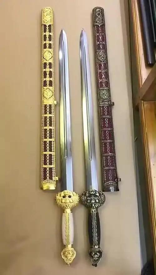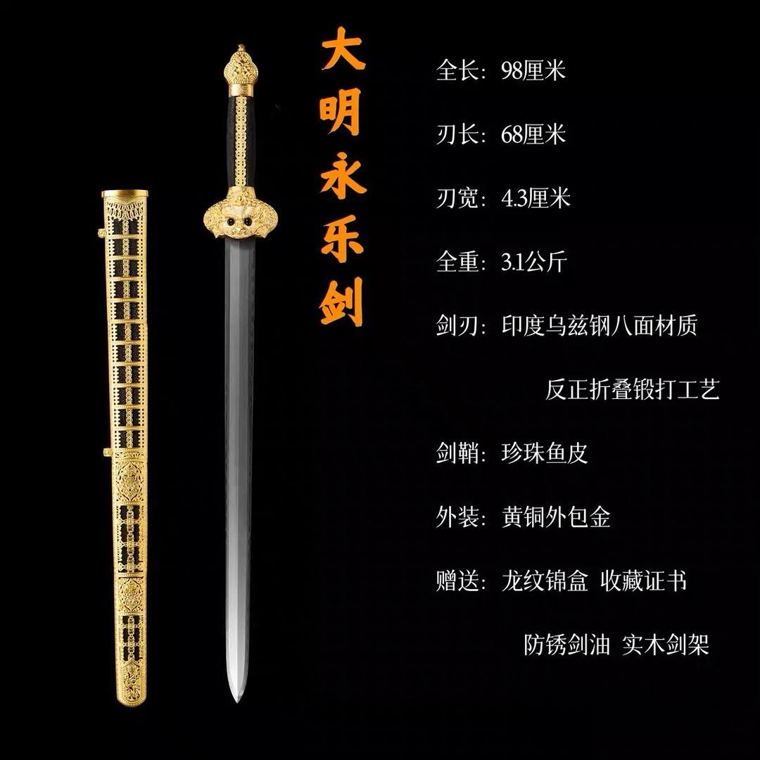 大明永乐剑,一把诞生于1420年明朝皇家工坊的绝世宝剑,是永乐皇帝朱棣命人打造的御赐宝物,曾作为国礼赠予西藏佛教领袖 。这把剑长90.3厘米,刃长76.2厘米,重1.3公斤,剑刃采用大马士革钢制法,剑柄和剑鞘饰以金银和宝石,工艺精湛,代表了中国古代刀剑制作的巅峰水平。