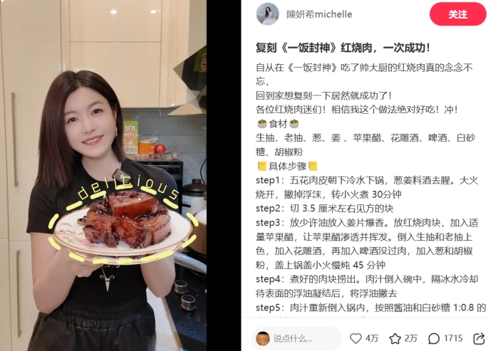 “用苹果醋做红烧肉”迅速成为美食圈的热门话题。连明星们也纷纷在社交平台分享自己在厨房尝试这道菜的过程,有人调侃“第一次把红烧肉做不腻,全靠苹果醋”。